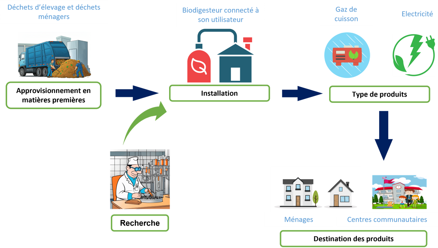 Le biogaz se présente sous forme gazeuse à température et pression ambiante. Il peut être utilisé pour la cuisson, le chauffage, l’éclairage, la cogénération et comme carburant (BAM,2024). En voici quelques illustrations (non exhaustive) :