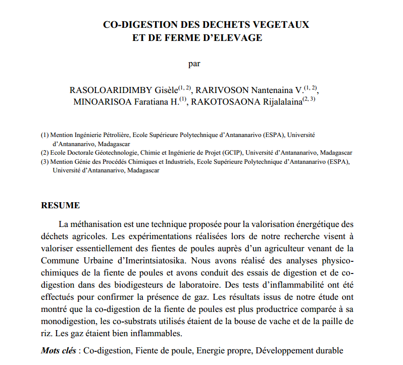 Ferme, élevage, Fiente de poule, Co-Digestion, Biodigesteurs, Biogaz, ESPA, Université d’Antananarivo, Madagascar.