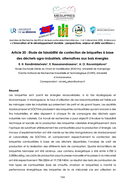 Briquette, Déchets agricoles, Déchets industrielles, Bois-énergie, Université de Mahajanga, CNRIT, IST, Université d’Antananarivo, Madagascar.