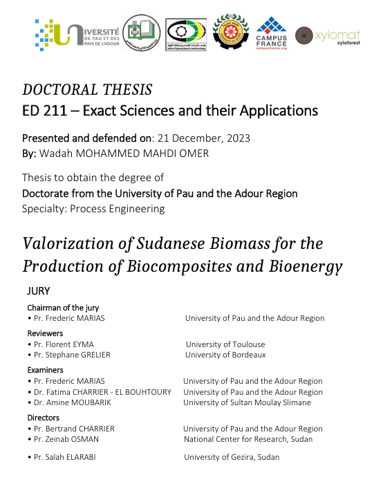 L’objectif de ce mémoire est de comparer les propriétés de trois types de biomasses produites au Soudan et d’analyser leur potentiel pour la production de biocomposites et de bioénergie. Les biomasses sélectionnées (bagasse, tiges de cotonnier et fibres de kénaf) ont été choisies en raison de leur importance économique pour le pays. Des analyses chimiques et physiques ont été réalisées dans ce travail pour déterminer la composition et le comportement thermique de ces biomasses. Les propriétés des panneaux fabriqués à partir de ces fibres ont été testées. L'étude a également exploré le potentiel de production de mousse biosourcée en utilisant différents types de tanins. Les essais de pyrolyse ont montré que les biomasses produisent des biochars avec des propriétés thermiques favorables, offrant un potentiel important pour des applications énergétiques futures.